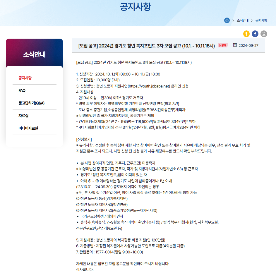 1. 경기도 청년 복지포인트 3차 모집 개요