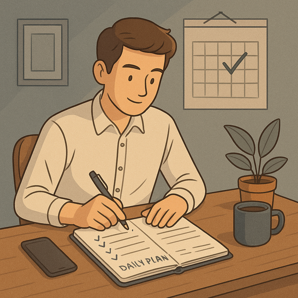 계획 없는 하루는 목적 없는 배와 같습니다. 성공한 사람들은 전날 밤이나 아침에 꼭 오늘의 일정, 우선순위, 기대 성과를 정리합니다. ‘오늘 가장 중요한 한 가지’를 먼저 끝내는 전략은 매우 효과적입니다.