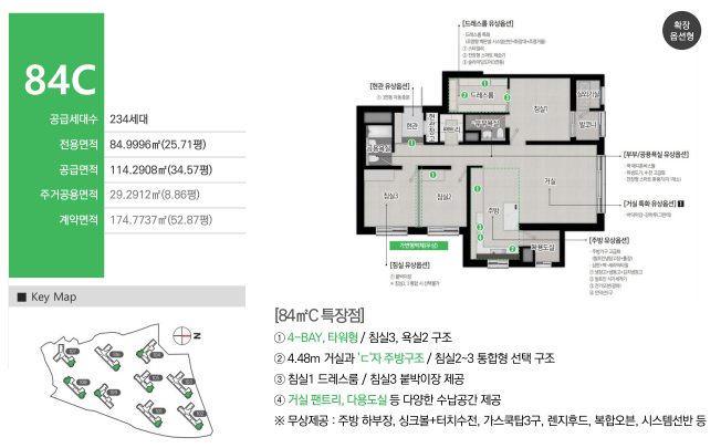 모든 타입이 팬트리, 드레스룸, 다용도실 등 수납 특화 설계를 갖추고 있으며, 고급 마감재 및 무상 옵션(복합오븐, 주방시스템선반 등)이 포함되어 있어 입주 시 만족도가 매우 높습니다.