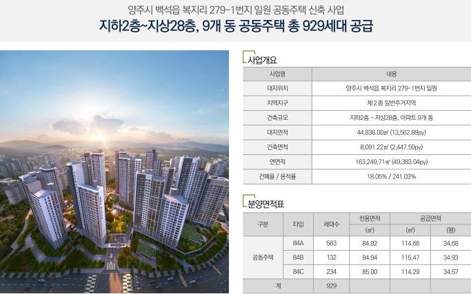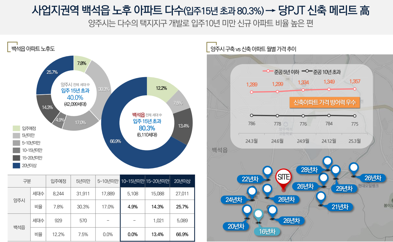 양주시는 2025년 기준 30~50대 주택 수요 비율이 46.4%로 매우 높으며, 백석읍의 경우 15년 이상 노후 아파트 비율이 80%를 넘습니다. 이러한 상황에서 신축 대단지인 본 아파트는 높은 희소가치를 가지며, 향후 가격 상승 여력 또한 매우 큽니다.