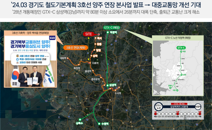 GTX-C, 1호선·3호선 연장, 서울-양주 고속도로 등 다양한 교통호재가 집결된 단지입니다. 특히 GTX-C 개통 시 삼성역까지 26분 내 도달 가능하며, 도시계획 도로(복지리 ~ 양주역) 개통 시 양주역(1호선)까지 5분 내 이동이 가능해져 교통망 개선이 극대화됩니다.