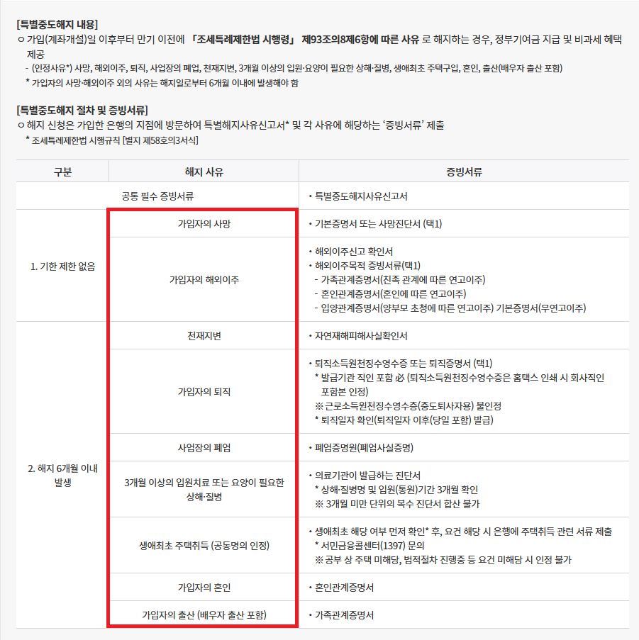 특별중도해지 : 청년도약계좌는 일반중도해지와는 별도로, '특별중도해지' 제도를 운영하고 있습니다. 불가피한 사유가 있을 경우 특별중도해지로 인정되어, 기존의 비과세 혜택과 정부기여금 수령이 가능합니다. (가입자의 사망, 해외이주 외의 사유는 해지일로부터 6개월 이내에 발생하니 주의하세요.)
